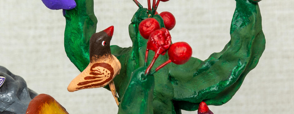 We chanced upon this piece of Mexican folk art while walking through shops in San Antonio's Market Square (the Mercado). The one-piece set 7" tall and is made entirely of clay with wires to connect the berries and birds. It is rather heavy with such a thick base and large clay features like the cave, tree and saguaro,